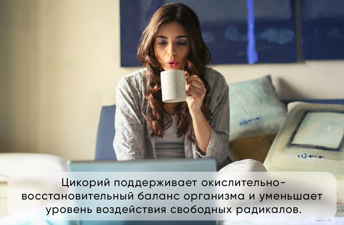 Благодаря своим антиоксидантным свойствам, цикорий поддерживает окислительно-восстановительный баланс организма и при регулярном употреблении уменьшает уровень воздействия свободных радикалов.