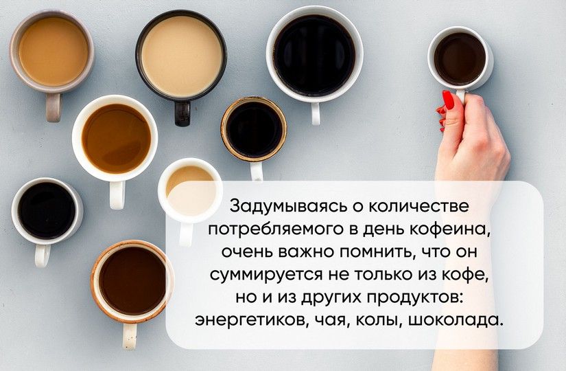 Задумываясь о количестве потребляемого в день кофеина, очень важно помнить, что он суммируется не только из ваших чашек капучино, но и из других продуктов (энергетики, чай, кола, шоколад, какао).