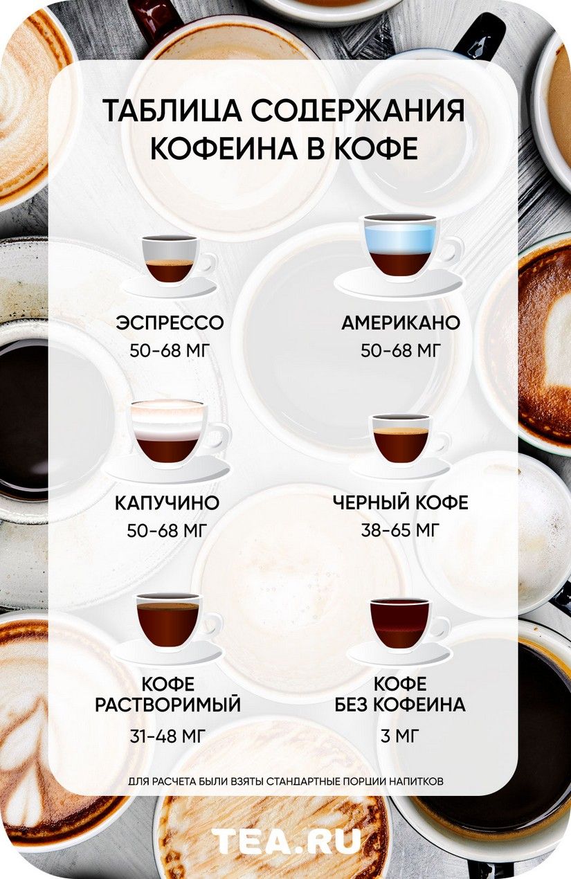 Стандартная чашка американо (70 мл.), эспрессо (30 мл.) или капучино (180 мл.) содержит около 50-70 мг кофеина (в них используется одно и то же количество кофе – 1 шот).